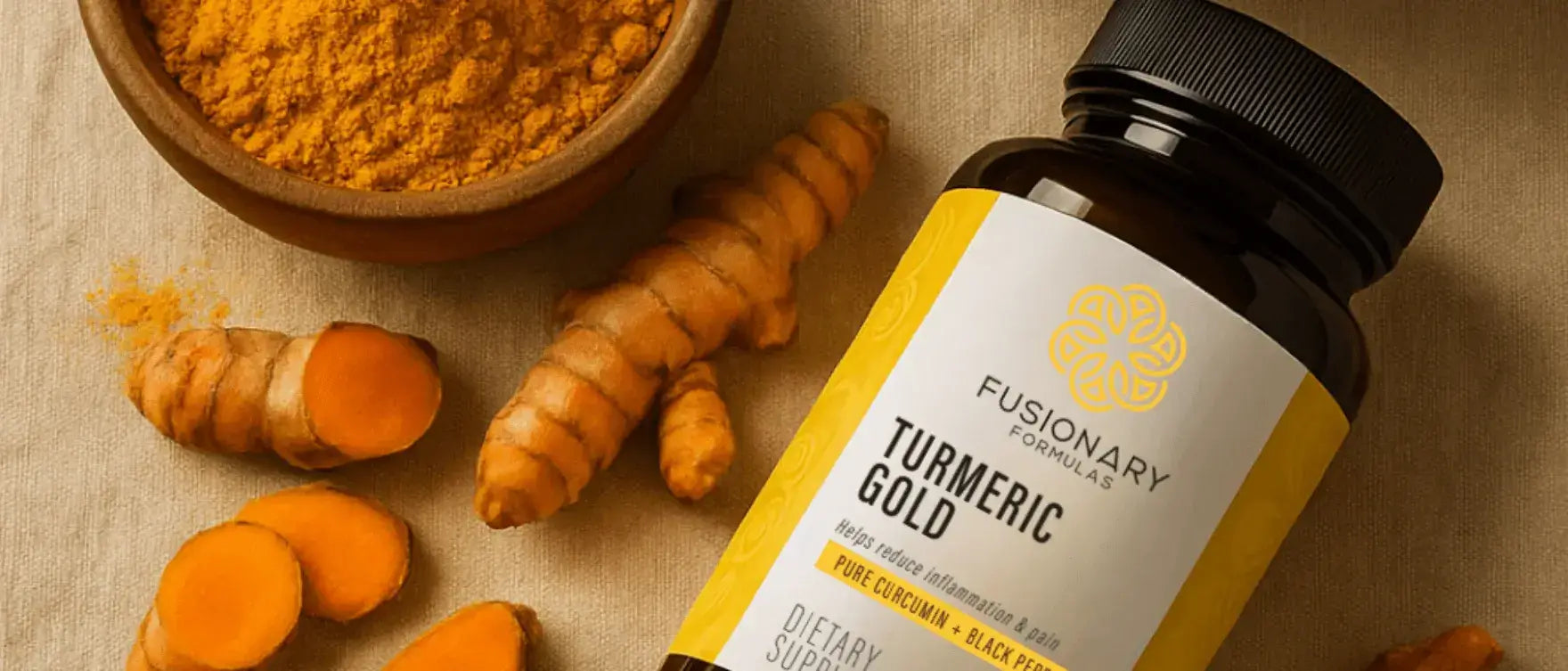 Turmeric Gold supplement bottle surrounded by turmeric root and powder for inflammation and vitality